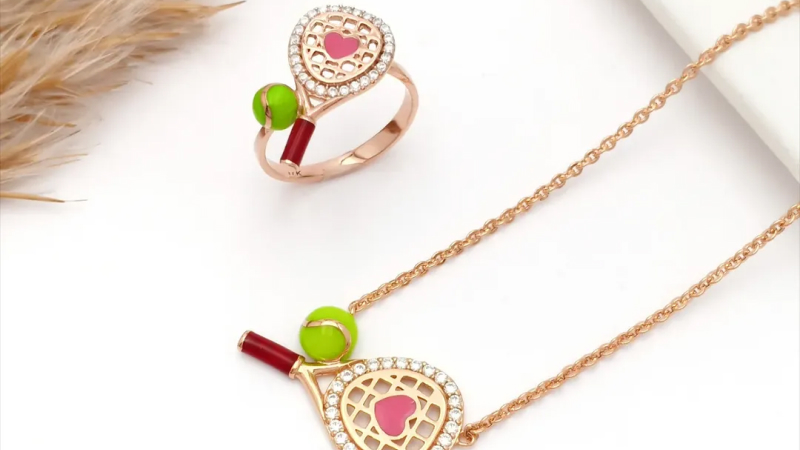 Set Gold Collection menampilkan perhiasan emas bernuansa sporty dengan ornamen raket dan bola padel.